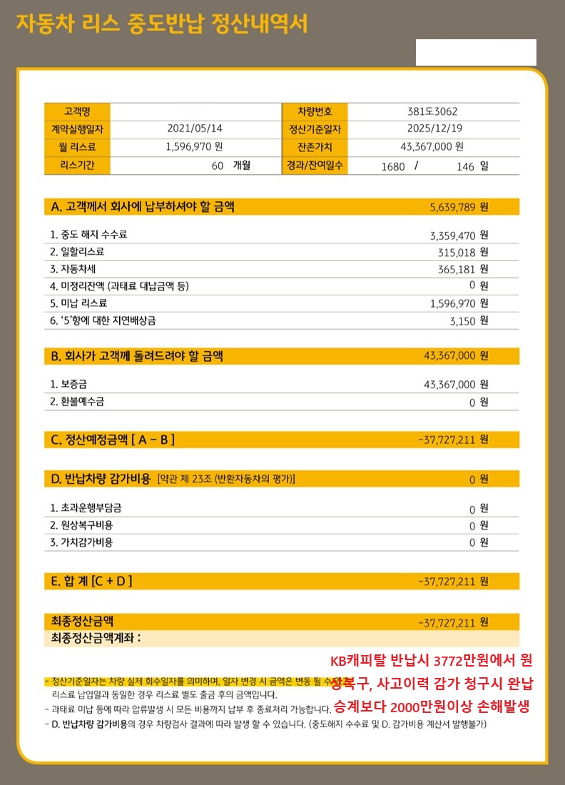 현재 KB캐피탈리스로 반납시에 회수가능한 금액은