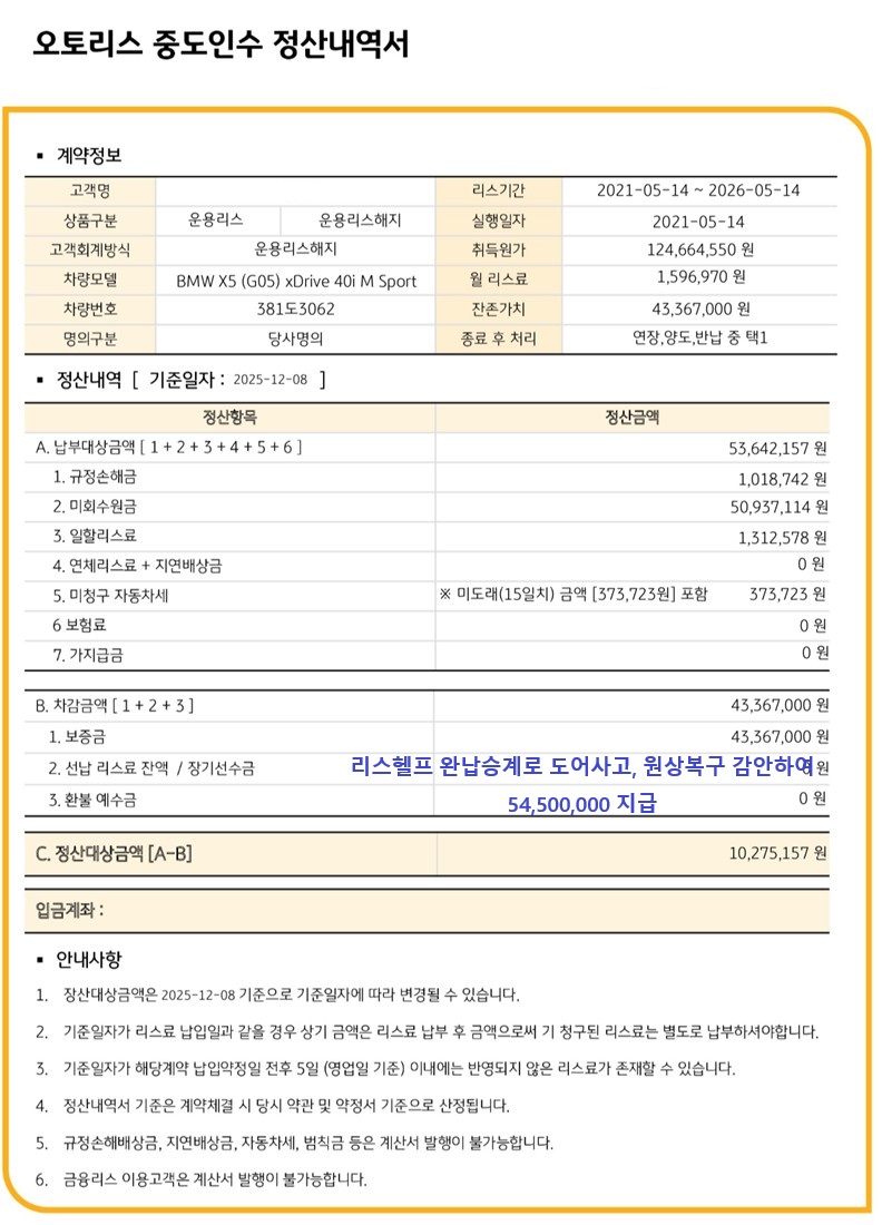 BMW X5 차량은 잔존가치(리스회사인수금액) 보다